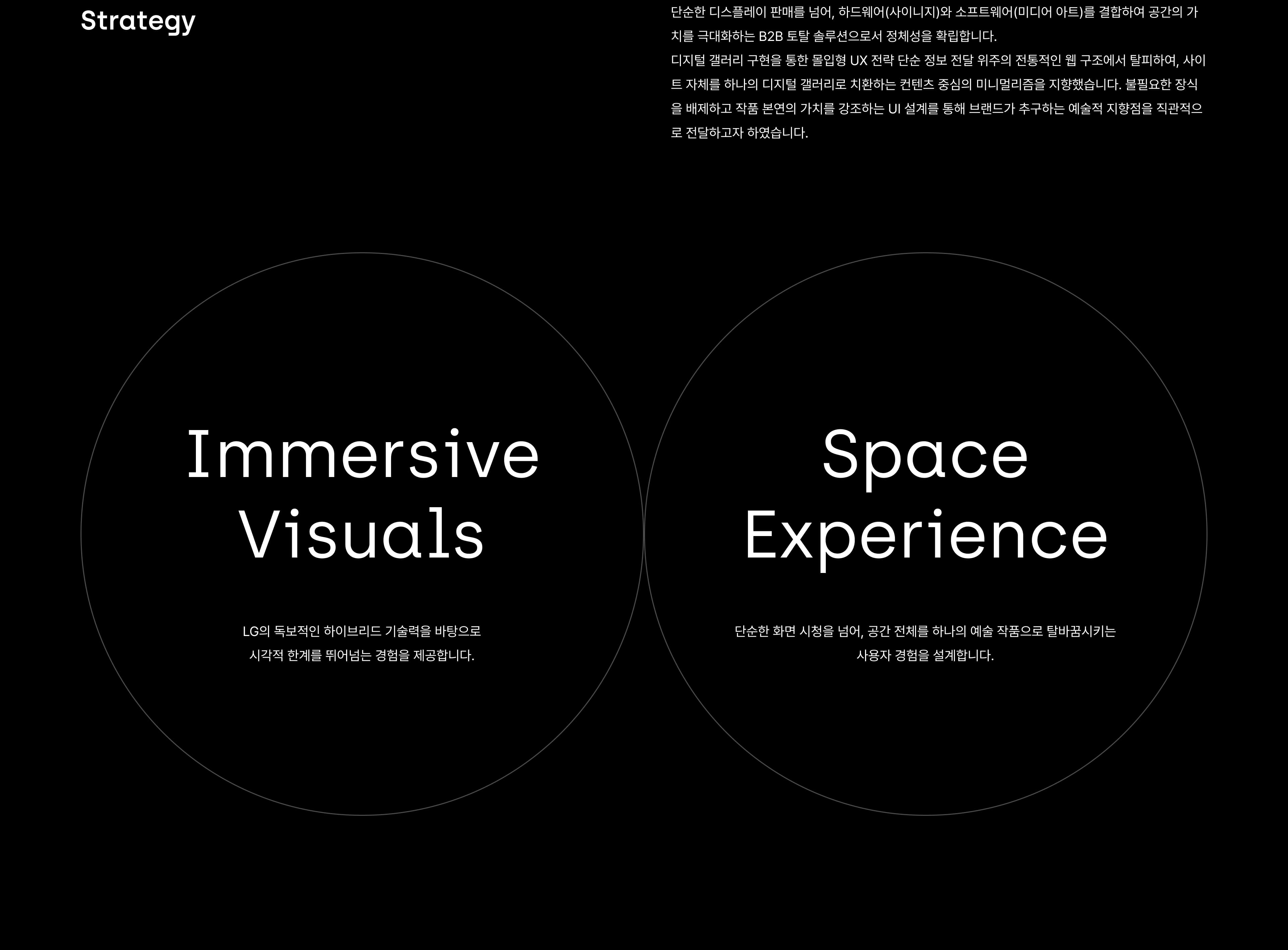 LG의 독보적인 사이니지 기술과 전문 미디어 콘텐츠를 결합하여, 고객의 공간에 영감과 몰입을 선사하는 'LG 미디어 아트 솔루션' 사이트를 구축했습니다. 국내외 정상급 미디어 아트 스튜디오와의 협업을 통해 현실과 가상의 경계를 허무는 감각적 경험을 설계했으며, 단순한 콘텐츠 제공을 넘어 공간 디자인부터 운영까지 전 과정을 아우르는 통합 솔루션을 구현했습니다. 이는 고성능 하드웨어와 예술적 소프트웨어가 결합된 LG만의 B2B 공간 혁신 모델을 명확히 보여줍니다.