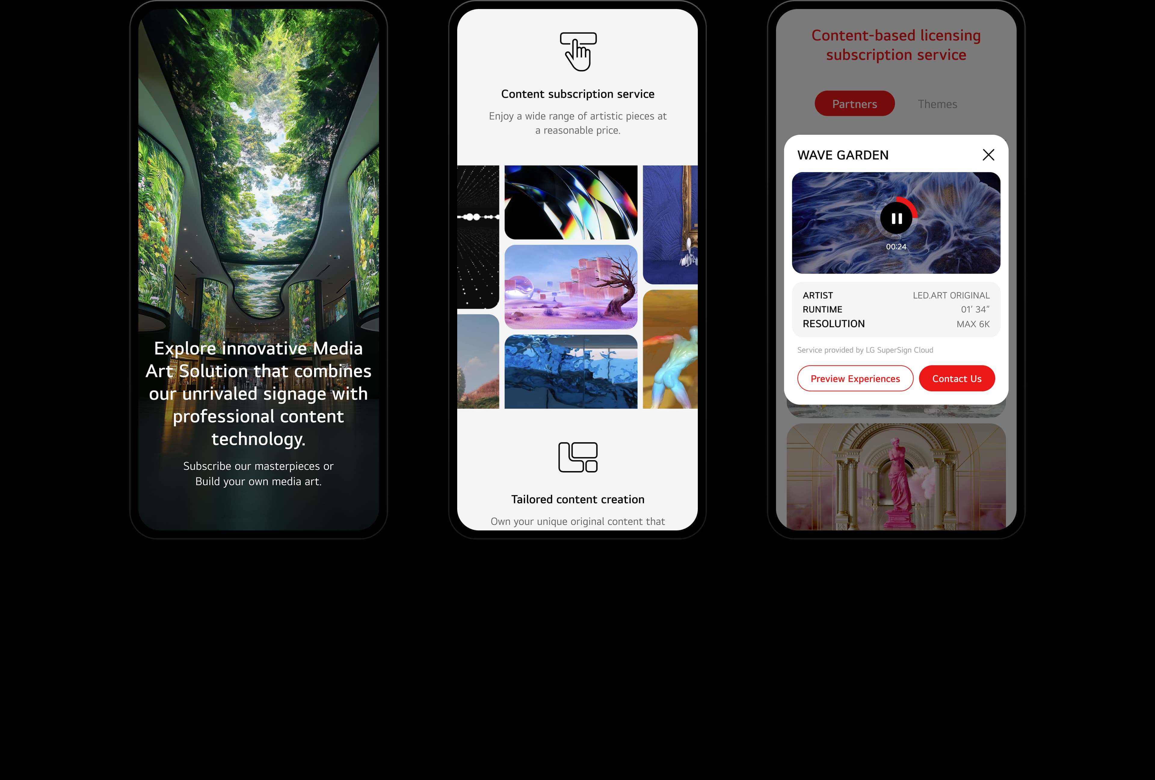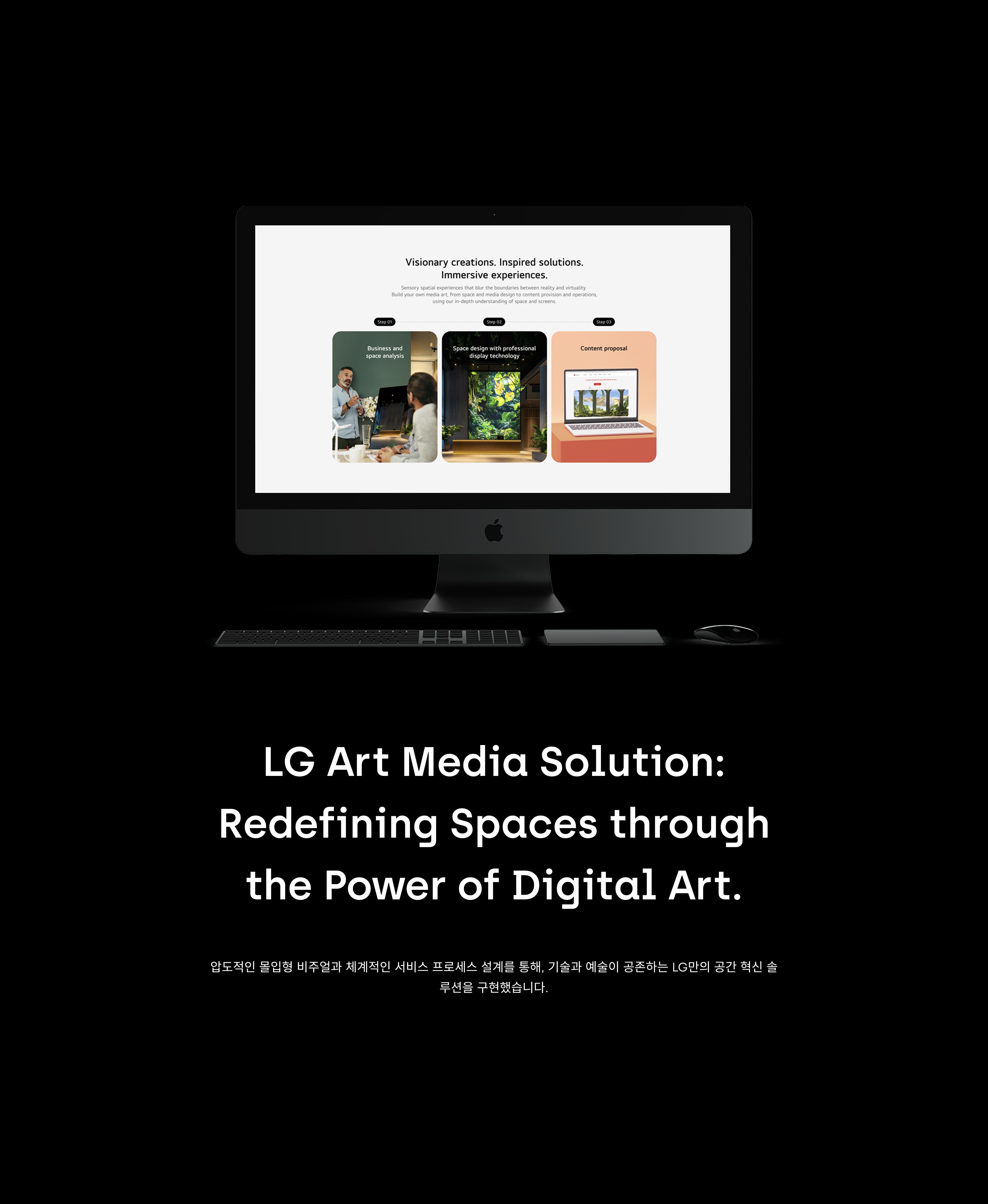 We've built the "LG Media Art Solution" website, combining LG's unrivaled signage technology with professional media content to deliver inspiration and immersion into customers' spaces. In collaboration with leading media art studios both domestically and internationally, we've designed a sensory experience that blurs the lines between reality and the virtual. Beyond simple content delivery, we've implemented an integrated solution encompassing the entire process, from space design to operation. This clearly demonstrates LG's unique B2B space innovation model, combining high-performance hardware and artistic software.